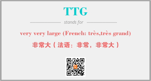 上述内容是“very very large (French: très,très grand)”作为“TTG”的缩写,解释为“非常大(法语:非常,非常大)”时的信息,以及英文缩略词TTG所代表的英文单词,其对应的中文拼音、详细解释以及在英文中的流行度和相关分类、应用领域及应用示例等。