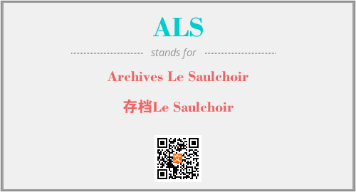 英文缩略词“ALS”经常作为“Archives Le Saulchoir”的英文缩写来使用,中文表示:“存档Le Saulchoir”。本文将详细介绍英文缩写词ALS所代表英文单词,其对应的中文拼音、详细解释以及在英语中的流行度。此外,还有关于缩略词ALS的分类、应用领域及相关应用示例等。