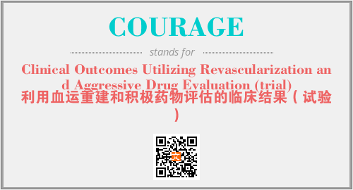 上述内容是“Clinical Outcomes Utilizing Revascularization and Aggressive Drug Evaluation (trial)”作为“COURAGE”的缩写,解释为“利用血运重建和积极药物评估的临床结果(试验)”时的信息,以及英文缩略词COURAGE所代表的英文单词,其对应的中文拼音、详细解释以及在英文中的流行度和相关分类、应用领域及应用示例等。