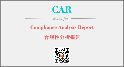 上述内容是“Compliance Analysis Report”作为“CAR”的缩写,解释为“合规性分析报告”时的信息,以及英文缩略词CAR所代表的英文单词,其对应的中文拼音、详细解释以及在英文中的流行度和相关分类、应用领域及应用示例等。