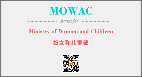 英文缩略词“MOWAC”经常作为“Ministry of Women and Children”的英文缩写来使用,中文表示:“妇女和儿童部”。本文将详细介绍英文缩写词MOWAC所代表英文单词,其对应的中文拼音、详细解释以及在英语中的流行度。此外,还有关于缩略词MOWAC的分类、应用领域及相关应用示例等。