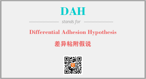 上述内容是“Differential Adhesion Hypothesis”作为“DAH”的缩写,解释为“差异粘附假说”时的信息,以及英文缩略词DAH所代表的英文单词,其对应的中文拼音、详细解释以及在英文中的流行度和相关分类、应用领域及应用示例等。
