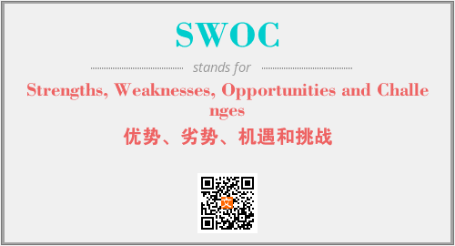 上述内容是“Strengths, Weaknesses, Opportunities and Challenges”作为“SWOC”的缩写,解释为“优势、劣势、机遇和挑战”时的信息,以及英文缩略词SWOC所代表的英文单词,其对应的中文拼音、详细解释以及在英文中的流行度和相关分类、应用领域及应用示例等。