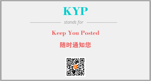 英文缩略词“KYP”经常作为“Keep You Posted”的英文缩写来使用,中文表示:“随时通知您”。本文将详细介绍英文缩写词KYP所代表英文单词,其对应的中文拼音、详细解释以及在英语中的流行度。此外,还有关于缩略词KYP的分类、应用领域及相关应用示例等。