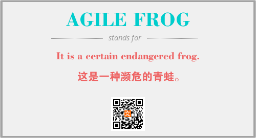 上述内容是“It is a certain endangered frog.”作为“AGILE FROG”的缩写,解释为“这是一种濒危的青蛙。”时的信息,以及英文缩略词AGILE FROG所代表的英文单词,其对应的中文拼音、详细解释以及在英文中的流行度和相关分类、应用领域及应用示例等。