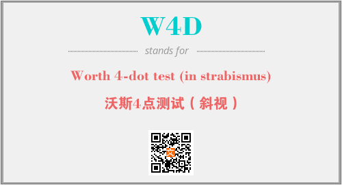 上述内容是“Worth 4-dot test (in strabismus)”作为“W4D”的缩写,解释为“沃斯4点测试(斜视)”时的信息,以及英文缩略词W4D所代表的英文单词,其对应的中文拼音、详细解释以及在英文中的流行度和相关分类、应用领域及应用示例等。