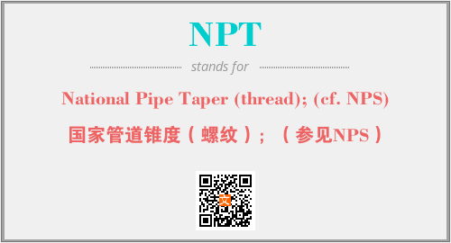 以上为National Pipe Taper (thread); (cf. NPS)英文缩略词NPT的中文解释,以及该英文缩写在英语的流行度、分类和应用领域方面的信息。