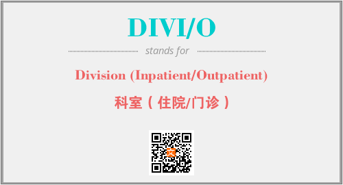 上述内容是“Division (Inpatient/Outpatient)”作为“DIVI/O”的缩写,解释为“科室(住院/门诊)”时的信息,以及英文缩略词DIVI/O所代表的英文单词,其对应的中文拼音、详细解释以及在英文中的流行度和相关分类、应用领域及应用示例等。