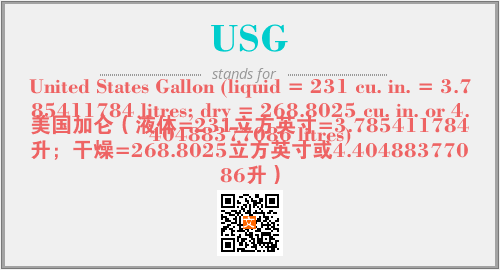 英文缩略词“USG”经常作为“United States Gallon (liquid = 231 cu. in. = 3.785411784 litres; dry = 268.8025 cu. in. or 4.40488377086 litres)”的英文缩写来使用,中文表示:“美国加仑(液体=231立方英寸=3.785411784升;干燥=268.8025立方英寸或4.40488377086升)”。本文将详细介绍英文缩写词USG所代表英文单词,其对应的中文拼音、详细解释以及在英语中的流行度。此外,还有关于缩略词USG的分类、应用领域及相关应用示例等。