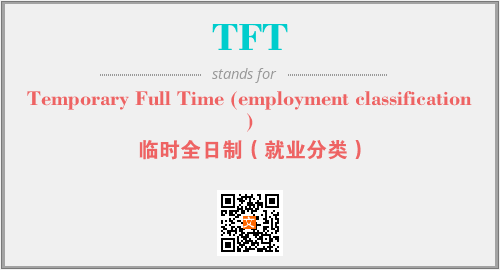 上述内容是“Temporary Full Time (employment classification)”作为“TFT”的缩写,解释为“临时全日制(就业分类)”时的信息,以及英文缩略词TFT所代表的英文单词,其对应的中文拼音、详细解释以及在英文中的流行度和相关分类、应用领域及应用示例等。