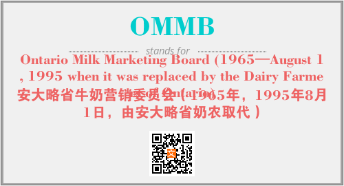 上述内容是“Ontario Milk Marketing Board (1965—August 1, 1995 when it was replaced by the Dairy Farmers of Ontario)”作为“OMMB”的缩写,解释为“安大略省牛奶营销委员会(1965年,1995年8月1日,由安大略省奶农取代)”时的信息,以及英文缩略词OMMB所代表的英文单词,其对应的中文拼音、详细解释以及在英文中的流行度和相关分类、应用领域及应用示例等。