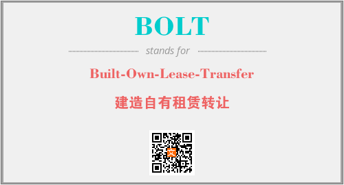 上述内容是“Built-Own-Lease-Transfer”作为“BOLT”的缩写,解释为“建造自有租赁转让”时的信息,以及英文缩略词BOLT所代表的英文单词,其对应的中文拼音、详细解释以及在英文中的流行度和相关分类、应用领域及应用示例等。