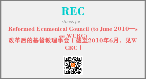 上述内容是“Reformed Ecumenical Council (to June 2010—see WCRC)”作为“REC”的缩写,解释为“改革后的基督教理事会(截至2010年6月,见WCRC)”时的信息,以及英文缩略词REC所代表的英文单词,其对应的中文拼音、详细解释以及在英文中的流行度和相关分类、应用领域及应用示例等。