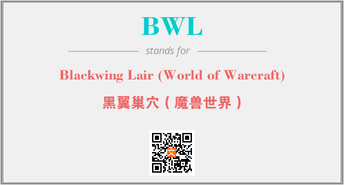 英文缩略词“BWL”经常作为“Blackwing Lair (World of Warcraft)”的英文缩写来使用,中文表示:“黑翼巢穴(魔兽世界)”。本文将详细介绍英文缩写词BWL所代表英文单词,其对应的中文拼音、详细解释以及在英语中的流行度。此外,还有关于缩略词BWL的分类、应用领域及相关应用示例等。