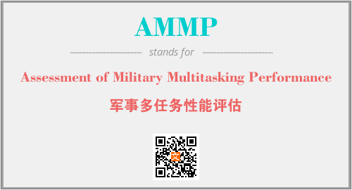 上述内容是“Assessment of Military Multitasking Performance”作为“AMMP”的缩写,解释为“军事多任务性能评估”时的信息,以及英文缩略词AMMP所代表的英文单词,其对应的中文拼音、详细解释以及在英文中的流行度和相关分类、应用领域及应用示例等。