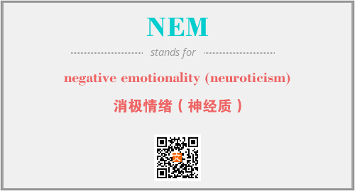 上述内容是“negative emotionality (neuroticism)”作为“NEM”的缩写,解释为“消极情绪(神经质)”时的信息,以及英文缩略词NEM所代表的英文单词,其对应的中文拼音、详细解释以及在英文中的流行度和相关分类、应用领域及应用示例等。