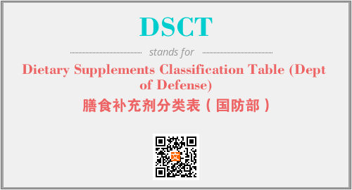 上述内容是“Dietary Supplements Classification Table (Dept of Defense)”作为“DSCT”的缩写,解释为“膳食补充剂分类表(国防部)”时的信息,以及英文缩略词DSCT所代表的英文单词,其对应的中文拼音、详细解释以及在英文中的流行度和相关分类、应用领域及应用示例等。