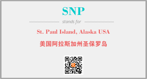 上述内容是“St. Paul Island, Alaska USA”作为“SNP”的缩写,解释为“美国阿拉斯加州圣保罗岛”时的信息,以及英文缩略词SNP所代表的英文单词,其对应的中文拼音、详细解释以及在英文中的流行度和相关分类、应用领域及应用示例等。