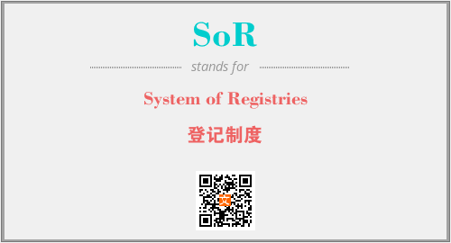 上述内容是“System of Registries”作为“SoR”的缩写,解释为“登记制度”时的信息,以及英文缩略词SoR所代表的英文单词,其对应的中文拼音、详细解释以及在英文中的流行度和相关分类、应用领域及应用示例等。