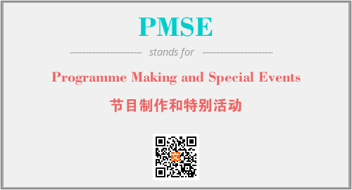 上述内容是“Programme Making and Special Events”作为“PMSE”的缩写,解释为“节目制作和特别活动”时的信息,以及英文缩略词PMSE所代表的英文单词,其对应的中文拼音、详细解释以及在英文中的流行度和相关分类、应用领域及应用示例等。