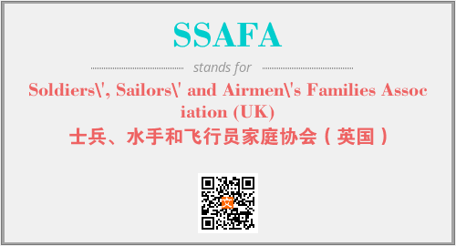 上述内容是“Soldiers\', Sailors\' and Airmen\'s Families Association (UK)”作为“SSAFA”的缩写,解释为“士兵、水手和飞行员家庭协会(英国)”时的信息,以及英文缩略词SSAFA所代表的英文单词,其对应的中文拼音、详细解释以及在英文中的流行度和相关分类、应用领域及应用示例等。