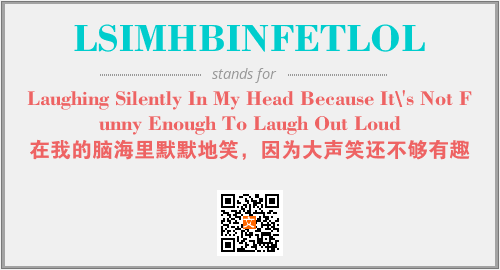 上述内容是“Laughing Silently In My Head Because It\'s Not Funny Enough To Laugh Out Loud”作为“LSIMHBINFETLOL”的缩写,解释为“在我的脑海里默默地笑,因为大声笑还不够有趣”时的信息,以及英文缩略词LSIMHBINFETLOL所代表的英文单词,其对应的中文拼音、详细解释以及在英文中的流行度和相关分类、应用领域及应用示例等。