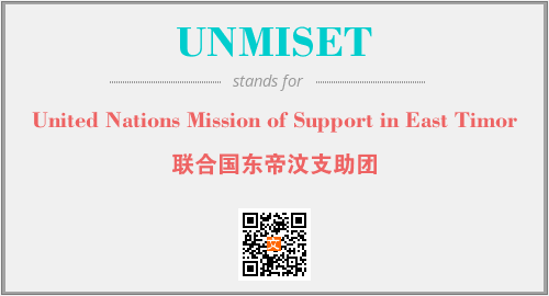 上述内容是“United Nations Mission of Support in East Timor”作为“UNMISET”的缩写,解释为“联合国东帝汶支助团”时的信息,以及英文缩略词UNMISET所代表的英文单词,其对应的中文拼音、详细解释以及在英文中的流行度和相关分类、应用领域及应用示例等。