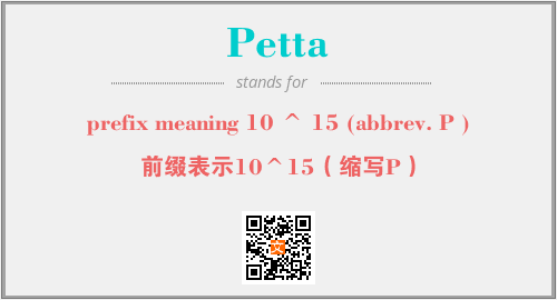上述内容是“prefix meaning 10 ^ 15 (abbrev. P )”作为“Petta”的缩写,解释为“前缀表示10^15(缩写P)”时的信息,以及英文缩略词Petta所代表的英文单词,其对应的中文拼音、详细解释以及在英文中的流行度和相关分类、应用领域及应用示例等。