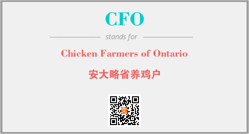 上述内容是“Chicken Farmers of Ontario”作为“CFO”的缩写,解释为“安大略省养鸡户”时的信息,以及英文缩略词CFO所代表的英文单词,其对应的中文拼音、详细解释以及在英文中的流行度和相关分类、应用领域及应用示例等。
