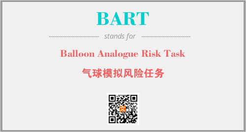 英文缩略词“BART”经常作为“Balloon Analogue Risk Task”的英文缩写来使用,中文表示:“气球模拟风险任务”。本文将详细介绍英文缩写词BART所代表英文单词,其对应的中文拼音、详细解释以及在英语中的流行度。此外,还有关于缩略词BART的分类、应用领域及相关应用示例等。