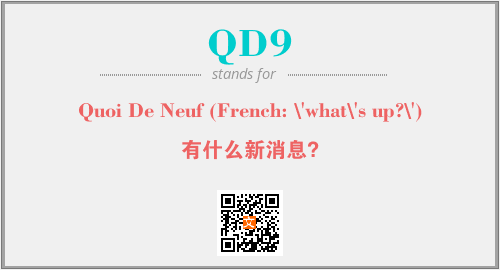 以上为Quoi De Neuf (French: \'what\'s up?\')英文缩略词QD9的中文解释,以及该英文缩写在英语的流行度、分类和应用领域方面的信息。