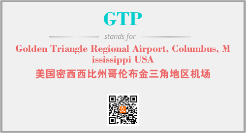 上述内容是“Golden Triangle Regional Airport, Columbus, Mississippi USA”作为“GTP”的缩写,解释为“美国密西西比州哥伦布金三角地区机场”时的信息,以及英文缩略词GTP所代表的英文单词,其对应的中文拼音、详细解释以及在英文中的流行度和相关分类、应用领域及应用示例等。
