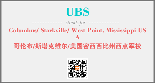 上述内容是“Columbus/ Starkville/ West Point, Mississippi USA”作为“UBS”的缩写,解释为“哥伦布/斯塔克维尔/美国密西西比州西点军校”时的信息,以及英文缩略词UBS所代表的英文单词,其对应的中文拼音、详细解释以及在英文中的流行度和相关分类、应用领域及应用示例等。