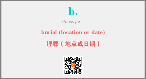 英文缩略词“b.”经常作为“burial (location or date)”的英文缩写来使用,中文表示:“埋葬(地点或日期)”。本文将详细介绍英文缩写词b.所代表英文单词,其对应的中文拼音、详细解释以及在英语中的流行度。此外,还有关于缩略词b.的分类、应用领域及相关应用示例等。
