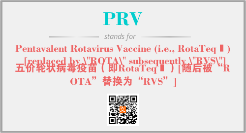 上述内容是“Pentavalent Rotavirus Vaccine (i.e., RotaTeq®) [replaced by \"ROTA\" subsequently \"RVS\"]”作为“PRV”的缩写,解释为“五价轮状病毒疫苗(即RotaTeq®)[随后被“ROTA”替换为“RVS”]”时的信息,以及英文缩略词PRV所代表的英文单词,其对应的中文拼音、详细解释以及在英文中的流行度和相关分类、应用领域及应用示例等。