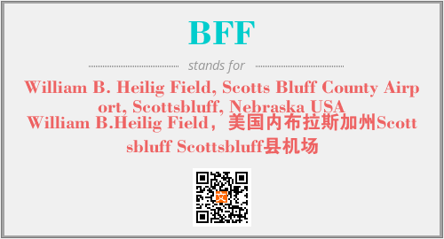 英文缩略词“BFF”经常作为“William B. Heilig Field, Scotts Bluff County Airport, Scottsbluff, Nebraska USA”的英文缩写来使用,中文表示:“William B.Heilig Field,美国内布拉斯加州Scottsbluff Scottsbluff县机场”。本文将详细介绍英文缩写词BFF所代表英文单词,其对应的中文拼音、详细解释以及在英语中的流行度。此外,还有关于缩略词BFF的分类、应用领域及相关应用示例等。