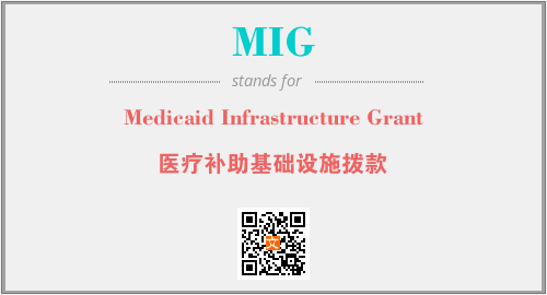 上述内容是“Medicaid Infrastructure Grant”作为“MIG”的缩写,解释为“医疗补助基础设施拨款”时的信息,以及英文缩略词MIG所代表的英文单词,其对应的中文拼音、详细解释以及在英文中的流行度和相关分类、应用领域及应用示例等。