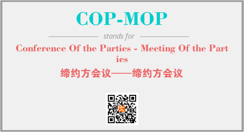 英文缩略词“COP-MOP”经常作为“Conference Of the Parties - Meeting Of the Parties”的英文缩写来使用,中文表示:“缔约方会议——缔约方会议”。本文将详细介绍英文缩写词COP-MOP所代表英文单词,其对应的中文拼音、详细解释以及在英语中的流行度。此外,还有关于缩略词COP-MOP的分类、应用领域及相关应用示例等。