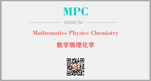 英文缩略词“MPC”经常作为“Mathematics Physics Chemistry”的英文缩写来使用,中文表示:“数学物理化学”。本文将详细介绍英文缩写词MPC所代表英文单词,其对应的中文拼音、详细解释以及在英语中的流行度。此外,还有关于缩略词MPC的分类、应用领域及相关应用示例等。