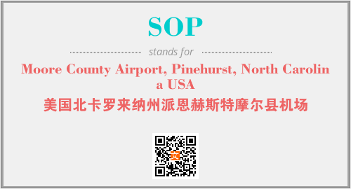 上述内容是“Moore County Airport, Pinehurst, North Carolina USA”作为“SOP”的缩写,解释为“美国北卡罗来纳州派恩赫斯特摩尔县机场”时的信息,以及英文缩略词SOP所代表的英文单词,其对应的中文拼音、详细解释以及在英文中的流行度和相关分类、应用领域及应用示例等。