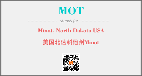 英文缩略词“MOT”经常作为“Minot, North Dakota USA”的英文缩写来使用,中文表示:“美国北达科他州Minot”。本文将详细介绍英文缩写词MOT所代表英文单词,其对应的中文拼音、详细解释以及在英语中的流行度。此外,还有关于缩略词MOT的分类、应用领域及相关应用示例等。