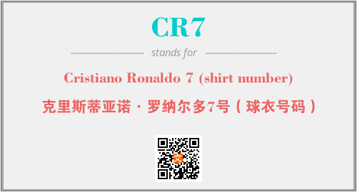 上述内容是“Cristiano Ronaldo 7 (shirt number)”作为“CR7”的缩写,解释为“克里斯蒂亚诺·罗纳尔多7号(球衣号码)”时的信息,以及英文缩略词CR7所代表的英文单词,其对应的中文拼音、详细解释以及在英文中的流行度和相关分类、应用领域及应用示例等。