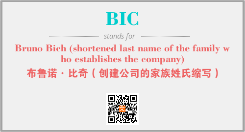 以上为Bruno Bich (shortened last name of the family who establishes the company)英文缩略词BIC的中文解释,以及该英文缩写在英语的流行度、分类和应用领域方面的信息。