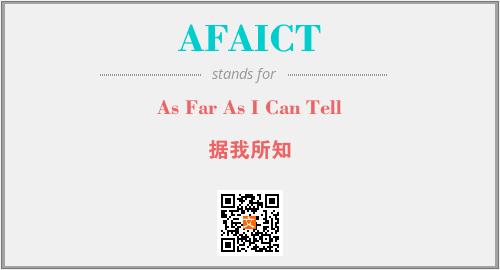 英文缩略词“AFAICT”经常作为“As Far As I Can Tell”的英文缩写来使用,中文表示:“据我所知”。本文将详细介绍英文缩写词AFAICT所代表英文单词,其对应的中文拼音、详细解释以及在英语中的流行度。此外,还有关于缩略词AFAICT的分类、应用领域及相关应用示例等。