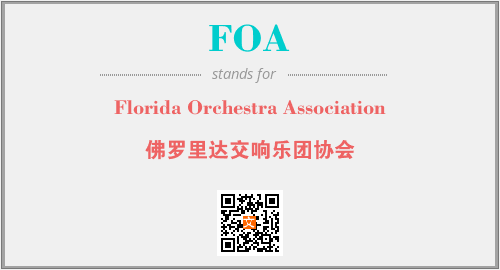 上述内容是“Florida Orchestra Association”作为“FOA”的缩写,解释为“佛罗里达交响乐团协会”时的信息,以及英文缩略词FOA所代表的英文单词,其对应的中文拼音、详细解释以及在英文中的流行度和相关分类、应用领域及应用示例等。