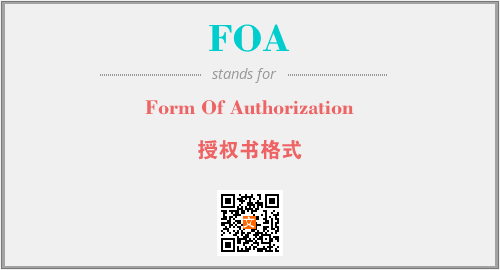 英文缩略词“FOA”经常作为“Form Of Authorization”的英文缩写来使用,中文表示:“授权书格式”。本文将详细介绍英文缩写词FOA所代表英文单词,其对应的中文拼音、详细解释以及在英语中的流行度。此外,还有关于缩略词FOA的分类、应用领域及相关应用示例等。