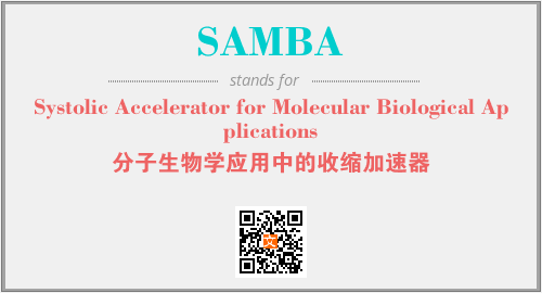 上述内容是“Systolic Accelerator for Molecular Biological Applications”作为“SAMBA”的缩写,解释为“分子生物学应用中的收缩加速器”时的信息,以及英文缩略词SAMBA所代表的英文单词,其对应的中文拼音、详细解释以及在英文中的流行度和相关分类、应用领域及应用示例等。