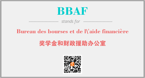 上述内容是“Bureau des bourses et de l\'aide financière”作为“BBAF”的缩写,解释为“奖学金和财政援助办公室”时的信息,以及英文缩略词BBAF所代表的英文单词,其对应的中文拼音、详细解释以及在英文中的流行度和相关分类、应用领域及应用示例等。