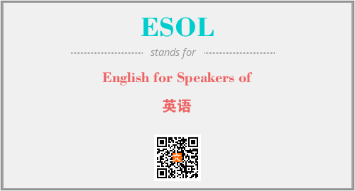 英文缩略词“ESOL”经常作为“English for Speakers of”的英文缩写来使用,中文表示:“英语”。本文将详细介绍英文缩写词ESOL所代表英文单词,其对应的中文拼音、详细解释以及在英语中的流行度。此外,还有关于缩略词ESOL的分类、应用领域及相关应用示例等。