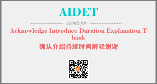 上述内容是“Acknowledge Introduce Duration Explanation Thank”作为“AIDET”的缩写,解释为“确认介绍持续时间解释谢谢”时的信息,以及英文缩略词AIDET所代表的英文单词,其对应的中文拼音、详细解释以及在英文中的流行度和相关分类、应用领域及应用示例等。